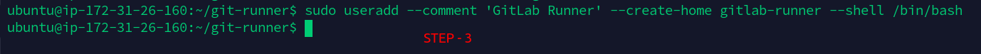Step 3) #add git CI usersudo useradd --comment 'GitLab Runner' --create-home gitlab-runner --shell /bin/bash